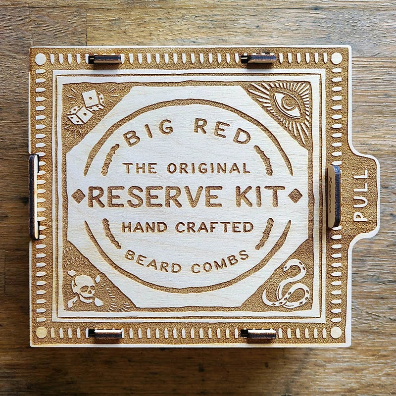 The Big Red Kit Collection offers a range of grooming elements designed for every stage of beard and moustache care. From compact moustache sets to full beard maintenance boxes, each kit pairs handcrafted hardwood combs with premium oils, balms, and grooming essentials.